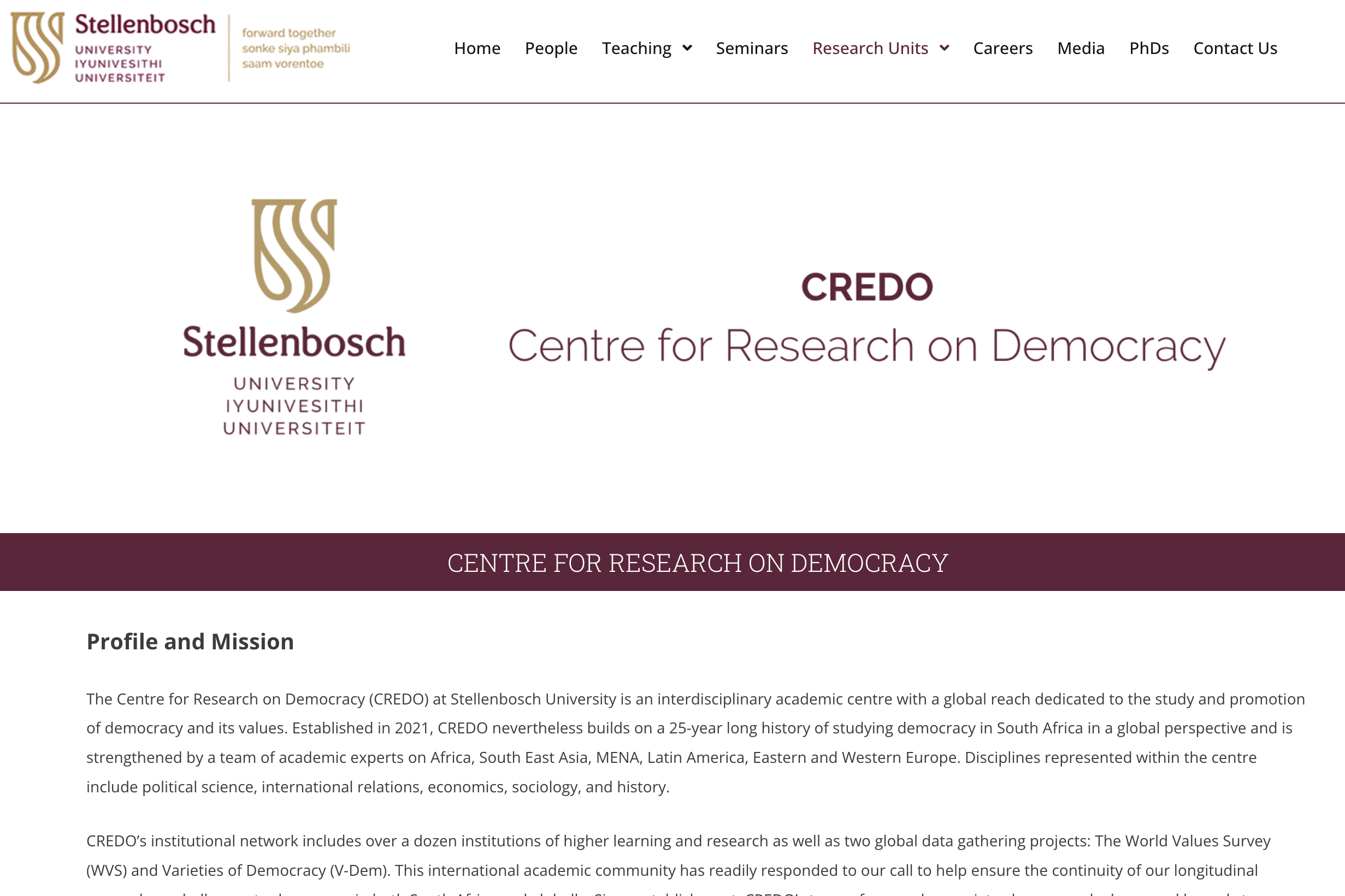 The Centre for Research on Democracy (CREDO) at Stellenbosch University is an interdisciplinary academic centre with a global reach dedicated to the study and promotion of democracy and its values. Established in 2021, CREDO nevertheless builds on a 25-year long history of studying democracy in South Africa in a global perspective and is strengthened by a team of academic experts on Africa, South East Asia, MENA, Latin America, Eastern and Western Europe. Disciplines represented within the centre include political science, international relations, economics, sociology, and history.