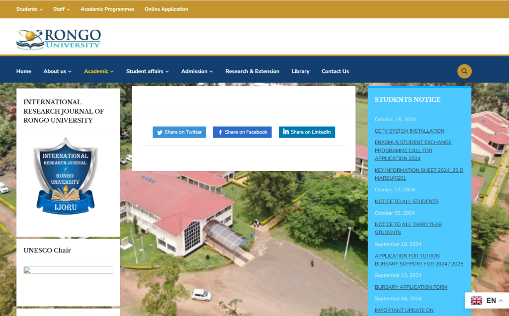 The Center for Media, Democracy, Peace and Security at Rongo University is an independent directorate that advances research and knowledge dissemination in media, democracy, peace, and security focusing on hosting visiting fellows, training workshops and seminars, writing policy briefs, curriculum development, academic programs in Media and Security, supporting local governance programs, countering violent and political extremism, crime and violence training, social media literacy programs, digital peacebuilding and youth empowerment in collaboration with local and international partners. The CMDPS mission is to conduct research, policy advocacy, and public education and offer academic programs geared toward enhancing the generation and dissemination of public information to promote democracy, peace, and security in Africa and beyond.