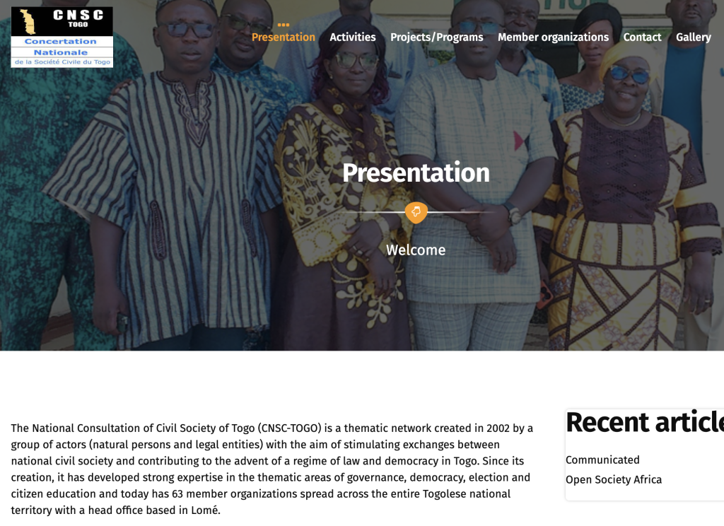 The goal of CNSC Togo is to stimulate exchanges between national civil society organizations and to contribute to the advent of a rule of law and democracy in Togo. Its objectives are to involve civil society organizations in the search for a concerted solution for the construction of democracy in Togo; to create a synergy between the partner movements for the reinforcement of the structures of the civil society, the networking and the dynamisation of the social movements at the base.