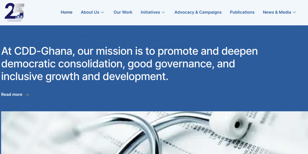 The Ghana Center for Democratic Development (CDD-Ghana) is an independent, not-for-profit research and advocacy think tank, working to advance democracy, good governance, and inclusive economic growth. CDD-Ghana works to complement the broader objectives of strengthening democratic governance, the principles of popular participation and the demand for public accountability. The Center harnesses the power of evidence-based research, ideas, partnerships to encourage dialogue, inform and influence public policy.