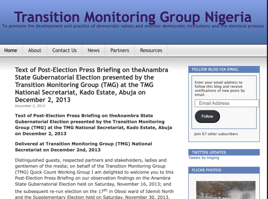 The Transition Monitoring Group (TMG) is the foremost independent civil society election observation organization in Nigeria. The organization seeks to secure the highest standards in the administration of elections in Nigeria by ensuring that the election management body and the electorates carry out their responsibilities during elections in accordance with the Law and internationally recognized standards for free and fair elections. It also seeks to ensure that good governance is entrenched in Nigeria through responsible leadership. To do these, it conducts civic and voter education to enlighten Nigerians about their civic/ voting rights and responsibilities.