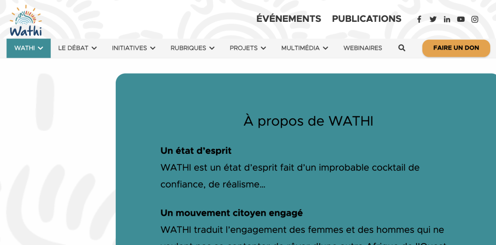 WATHI, a civil society organization focusing on West Africa, intends to be an inclusive, multidisciplinary and innovative citizen think tank. WATHI offers an interactive platform to all interested and capable individuals concerned about West Africa’s future. This organization is for those who wish to contribute to the acceleration of the political, institutional, social, and cultural changes needed to make the region a better place. This change can occur through knowledge creation and dissemination, experience sharing, and collective action.