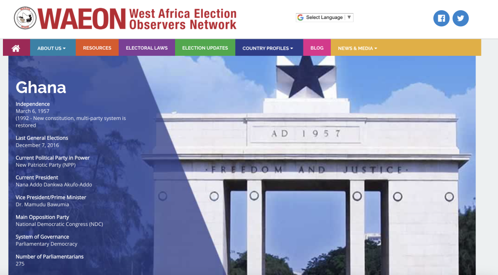 The West Africa Election Observers Network (WAEON) is an independent, non-partisan and non-religious organization that aims at strengthening and supporting Citizens‘ Election Observation Groups (CEOGs) in the sub-region. WAEON comprises independent and non-partisan CEOGs in West Africa that subscribe to the Declaration of Global Principles for Non-partisan Election Observation and Monitoring by Citizen Organizations. The network envisions a West Africa that is democratic, where governments are held accountable through regular and credible elections and citizens effectively participate in the electoral process through professional observation of elections.